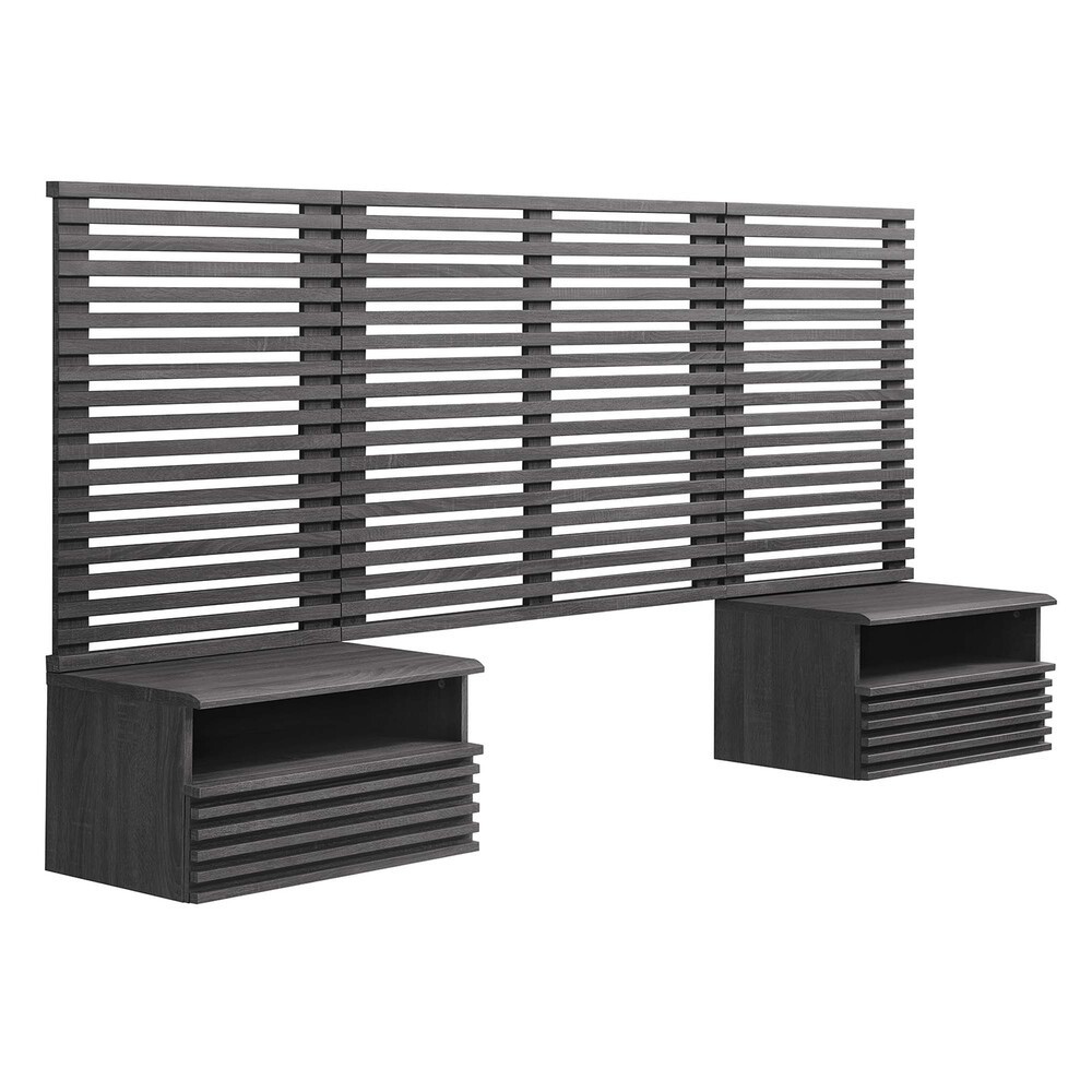 Tap into mid-century aesthetics with the Render Wall-Mount Twin Headboard and Nightstands Set. With slatted detail commanding a presence in a kid's bedroom or guest bedroom, this twin size headboard is a collection of panels that feature durable particleboard frames with smooth wood grain laminate. The full-extension glide drawers and open shelves on the nightstands offer ample storage space to keep bedside essentials neat and organized. Both the headboard and the 1-drawer nightstands mount directly to the wall at your desired height to create an eye-catching backdrop in the bedroom.